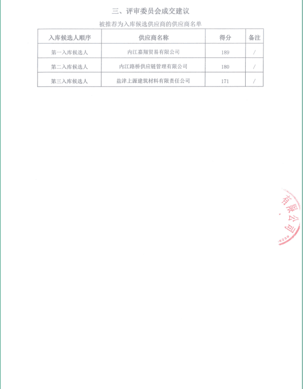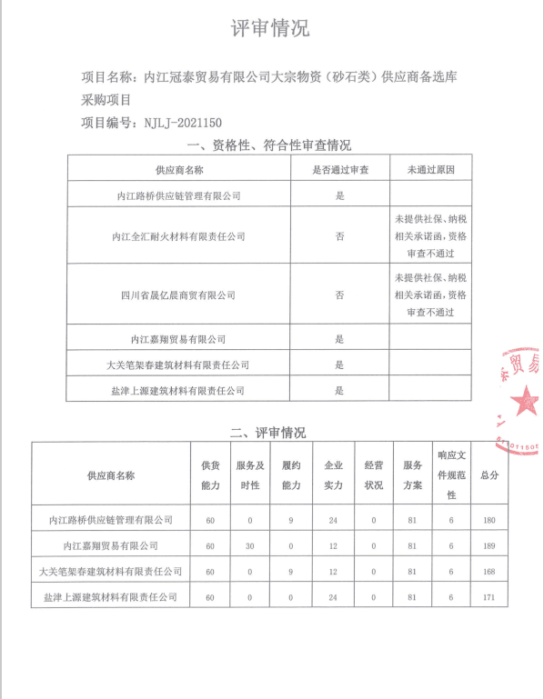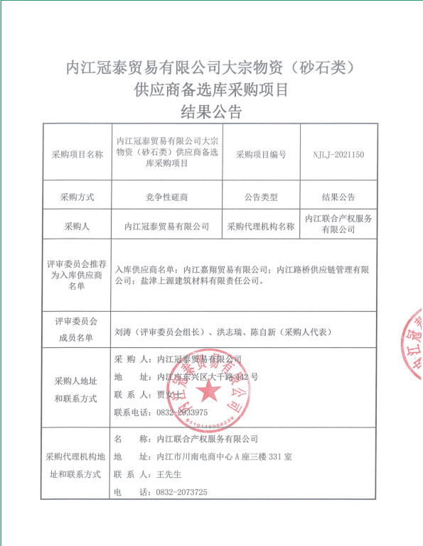 内江冠泰贸易有限公司大宗物资(砂石类)供应商备选库采购项目结果公告