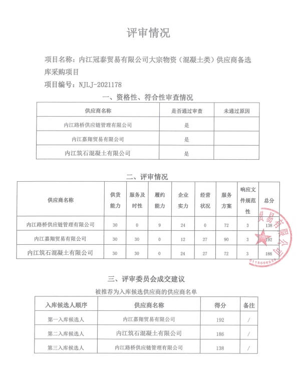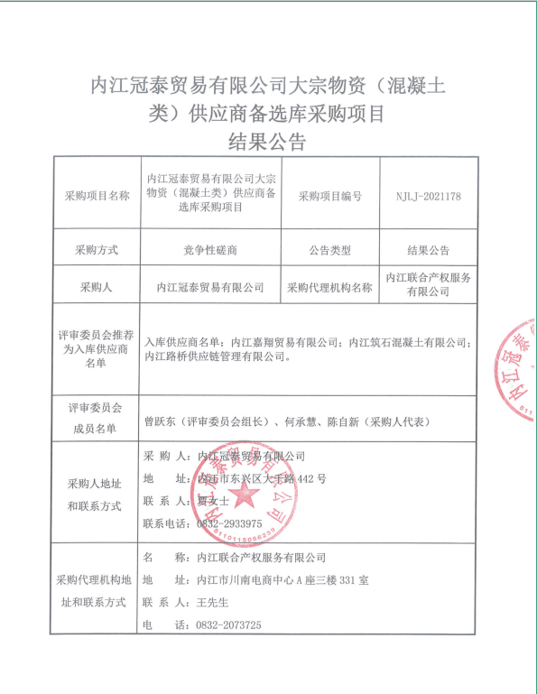内江冠泰贸易有限公司大宗物资(混凝土类)供应商备选库采购项目结果公告