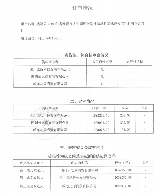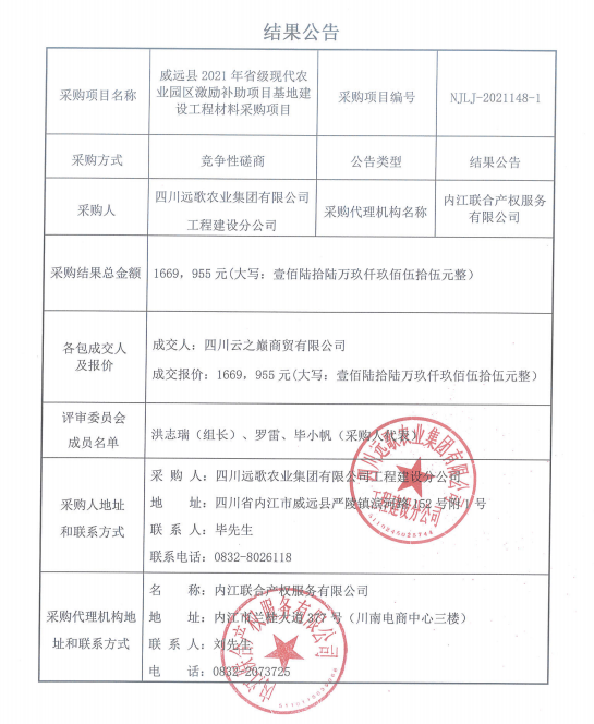 威远县2021年省级现代农业园区激励补助项目基地建设工程材料采购项目结果公告