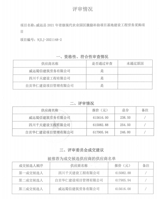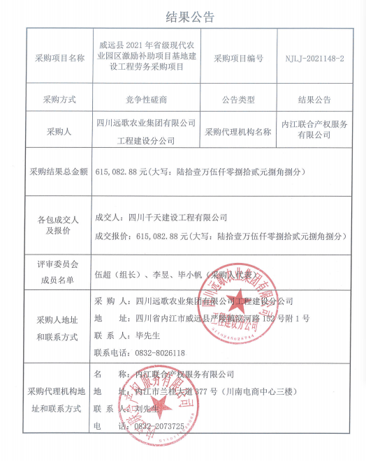 威远县2021年省级现代农业园区激励补助项目基地建设工程劳务采购项目结果公告