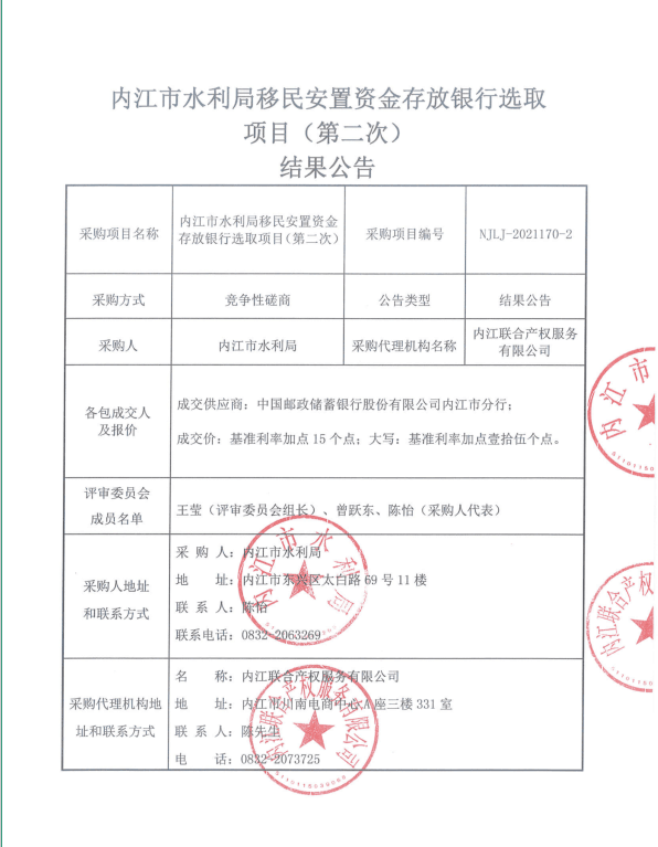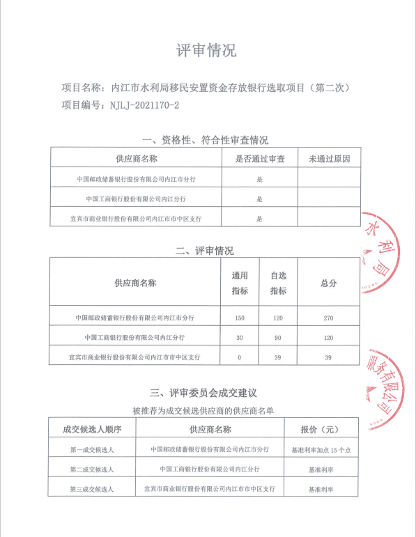内江市水利局移民安置资金存放银行选取项目(第二次)结果公告