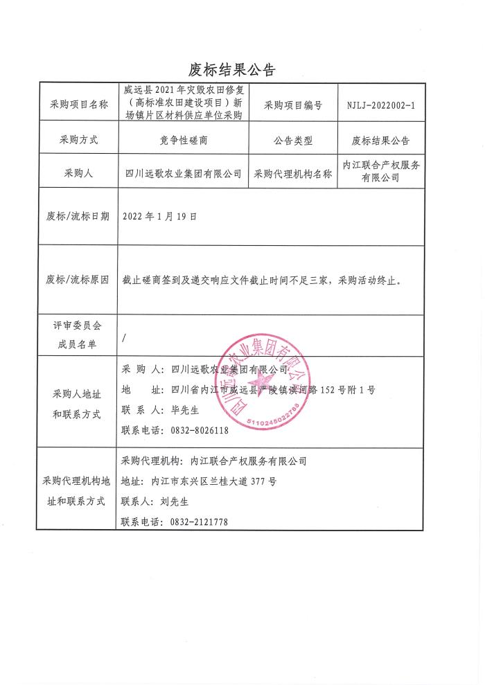 威远县2021年灾毁农田修复(高标准农田建设项目)新场镇片区材料供应单位采购项目废标结果公告