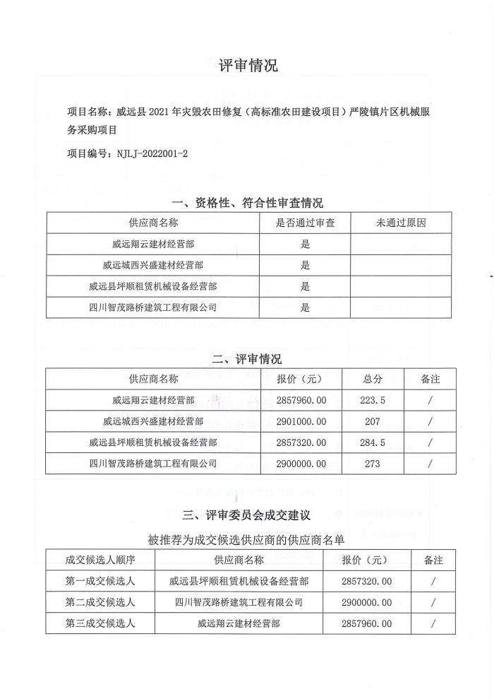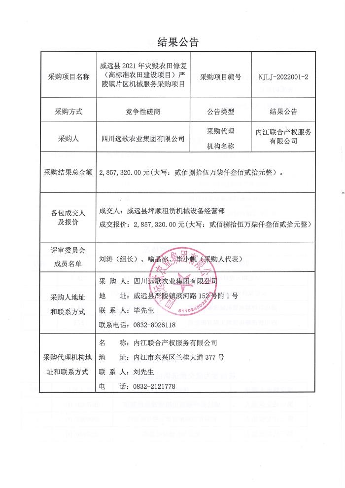 威远县2021年灾毁农田修复(高标准农田建设项目)严陵镇片区机械服务采购项目结果公告