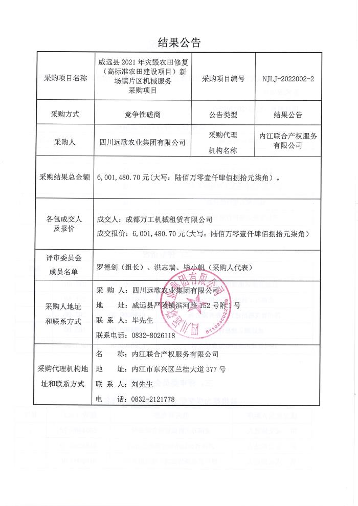 威远县2021年灾毁农田修复(高标准农田建设项目)新场镇片区机械服务采购项目结果公告