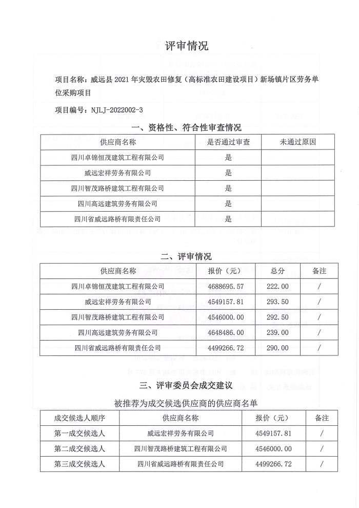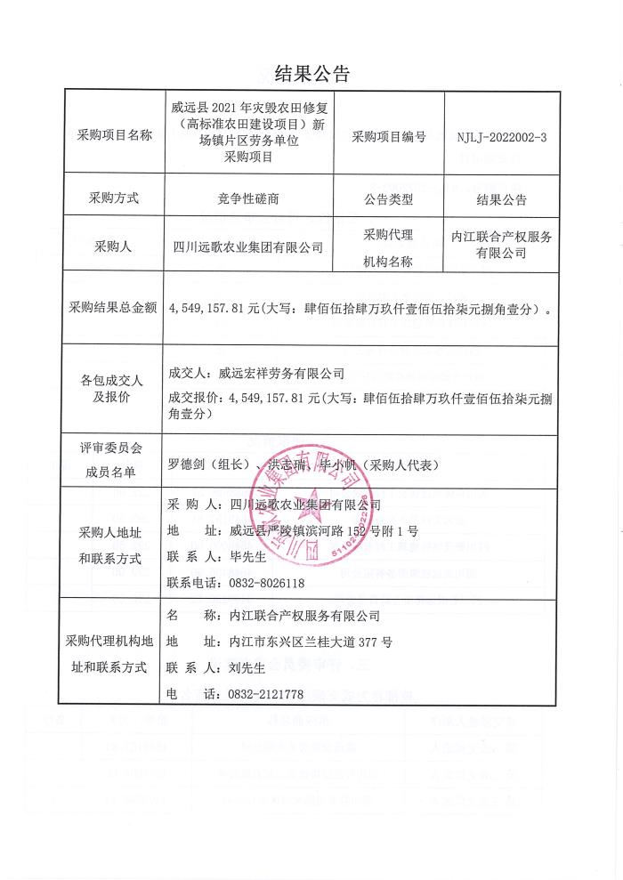 威远县2021年灾毁农田修复(高标准农田建设项目)新场镇片区劳务单位采购项目结果公告
