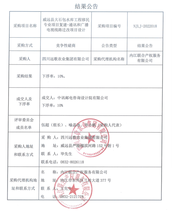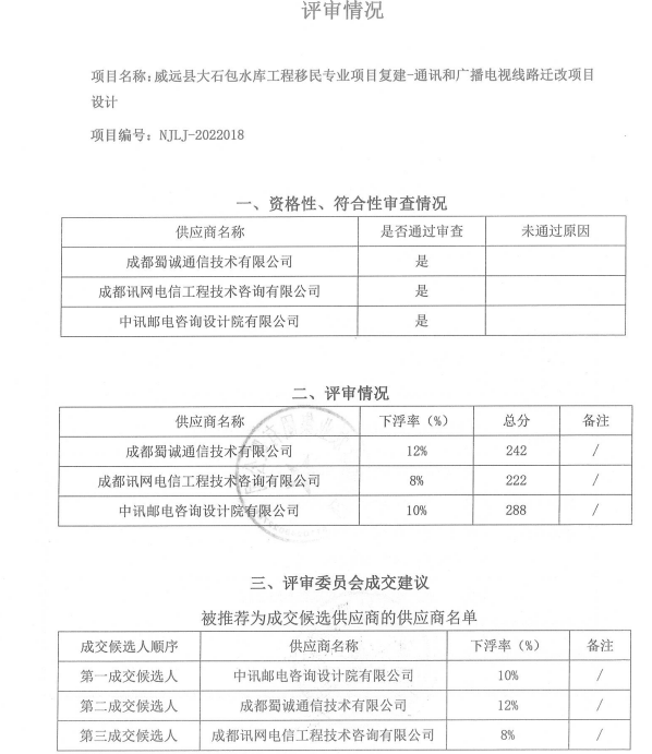 威远县大石包水库工程移民专业项目复建-通讯和广播电视线路迁改项目设计结果公告
