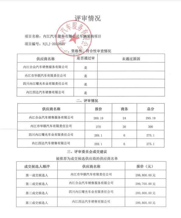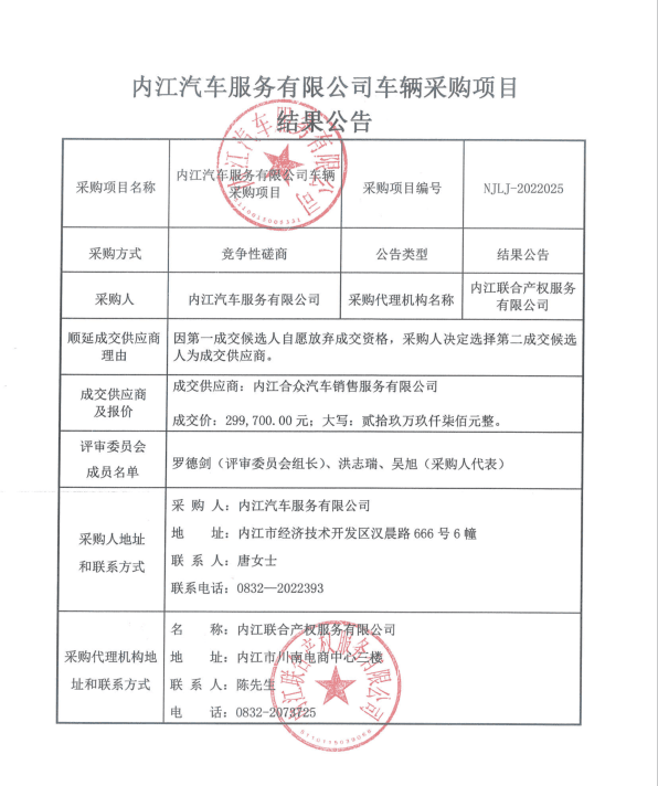 内江汽车服务有限公司车辆采购项目结果公告