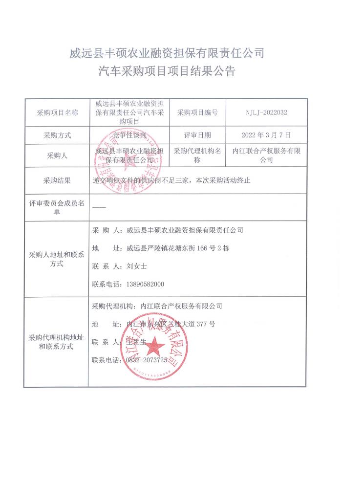 威远县丰硕农业融资担保有限责任公司汽车采购结果公告