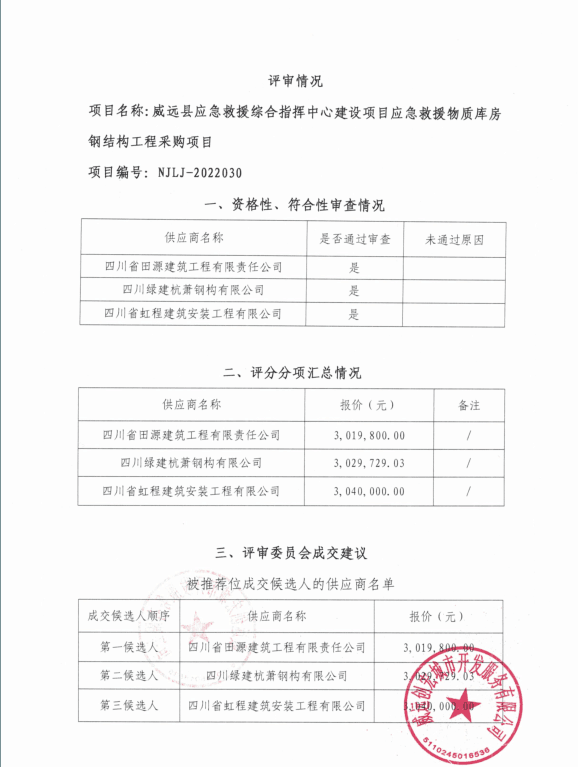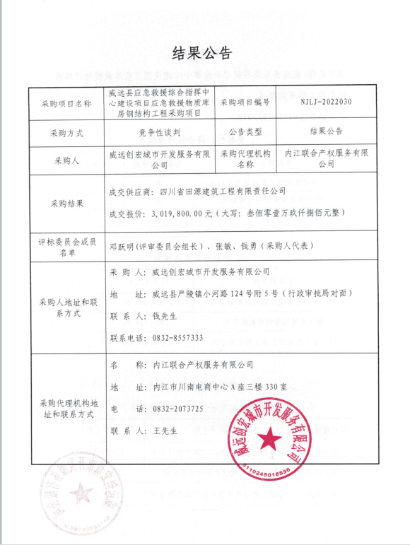威远县应急救援综合指挥中心建设项目应急救援物质库房钢结构工程采购项目结果公告