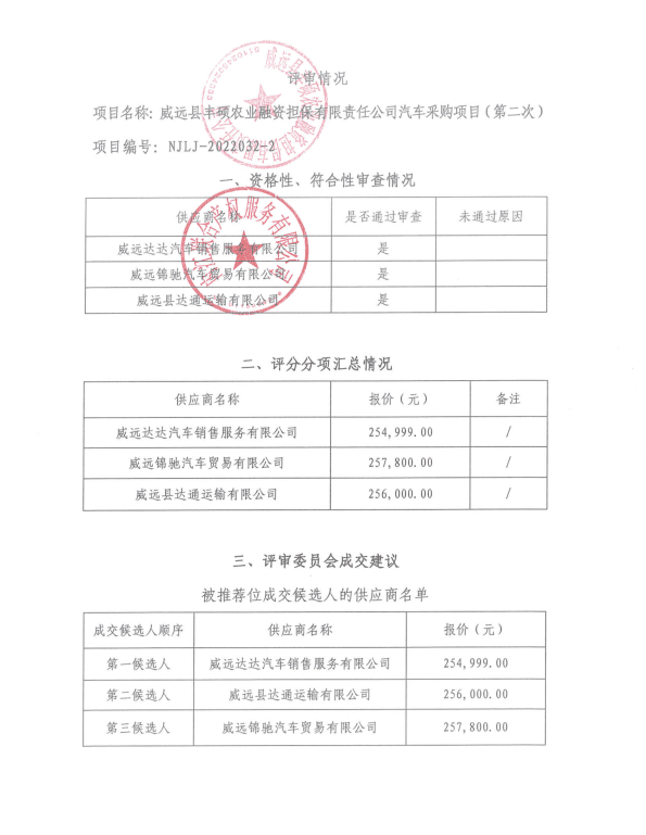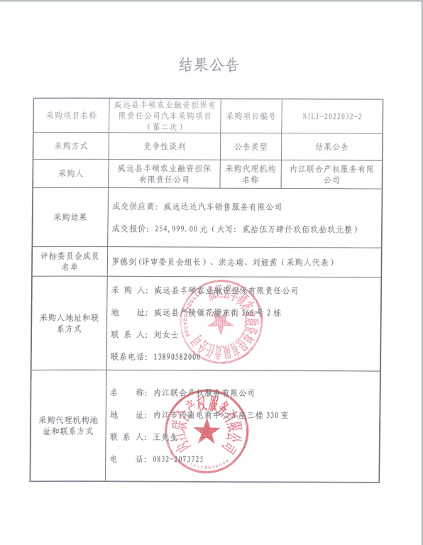 威远县丰硕农业融资担保有限责任公司汽车采购项目(第二次)结果公告