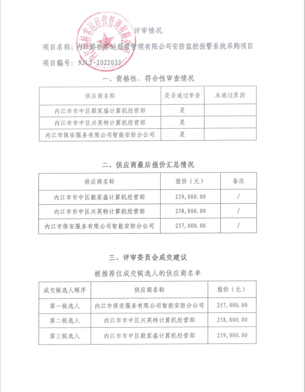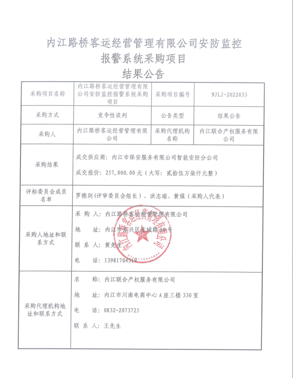 内江路桥客运经营管理有限公司安防监控报警系统采购项目结果公告