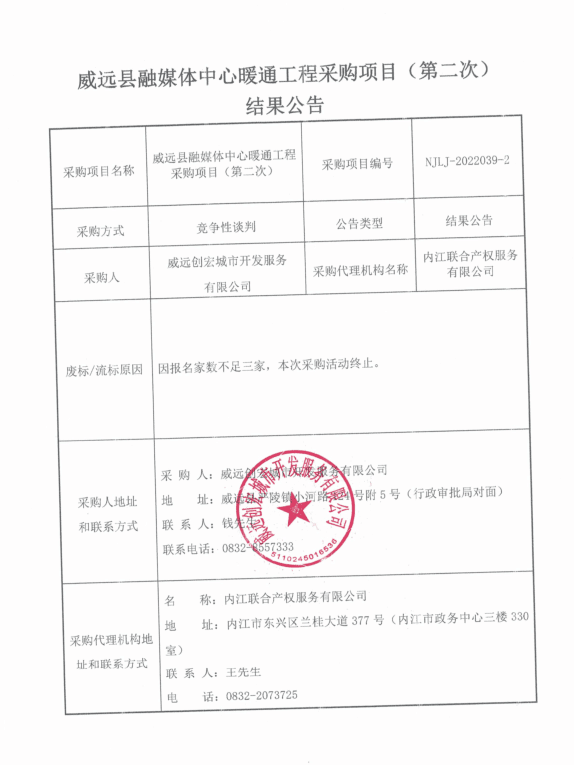 威远县融媒体中心暖通工程采购项目(第二次)结果公告