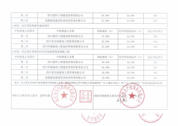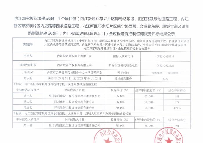 内江邓家坝新城建设项目4个项目包(内江新区邓家坝片区锦绣路东段、顺江路及绿地道路工程,内江新区邓家坝片区内史路等四条道路工程,内江新区邓家坝片区康宁路西段、文澜路东段、甜城大道及晴川路侧绿地建设项目,内江邓家坝绿环建设项目)全过程造价控制咨询服务评标结果公示