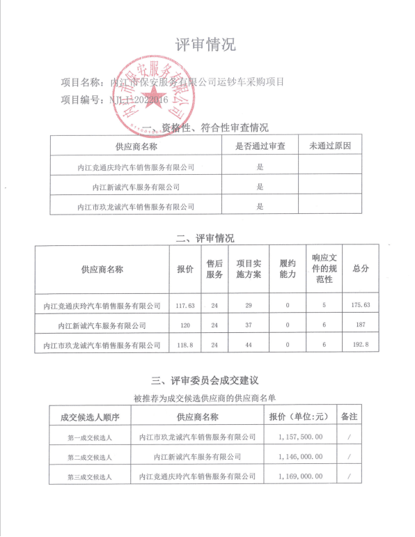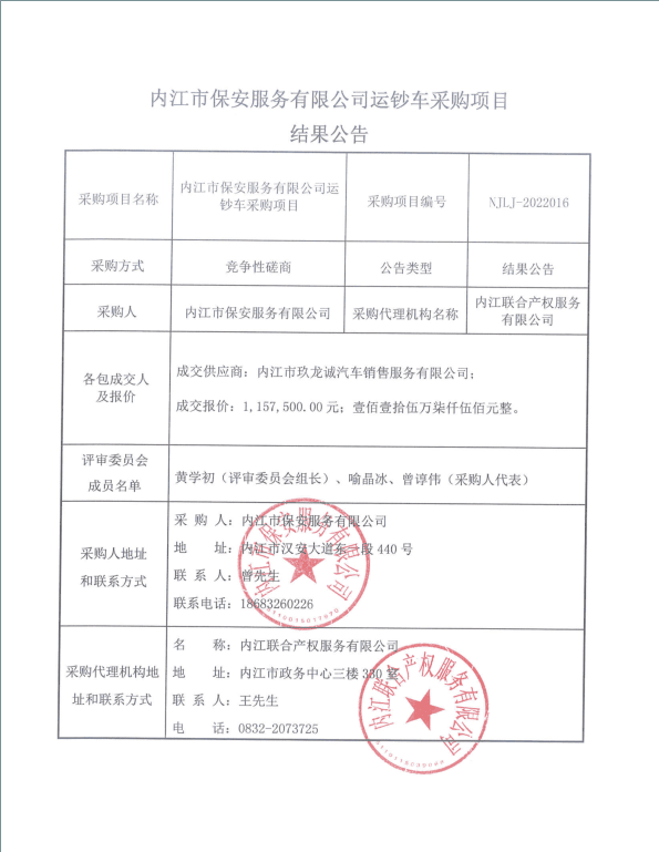 内江市保安服务有限公司运钞车采购项目结果公告