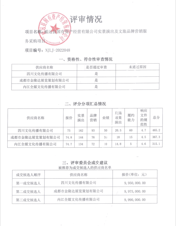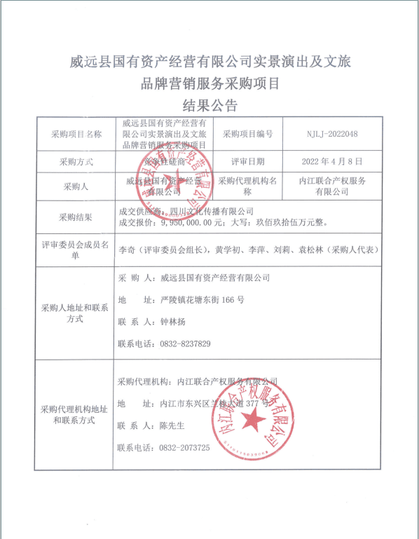 威远县国有资产经营有限公司实景演出及文旅品牌营销服务采购项目结果公告