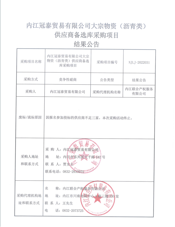 内江冠泰贸易有限公司大宗物资(沥青类)供应商备选库采购项目结果公告