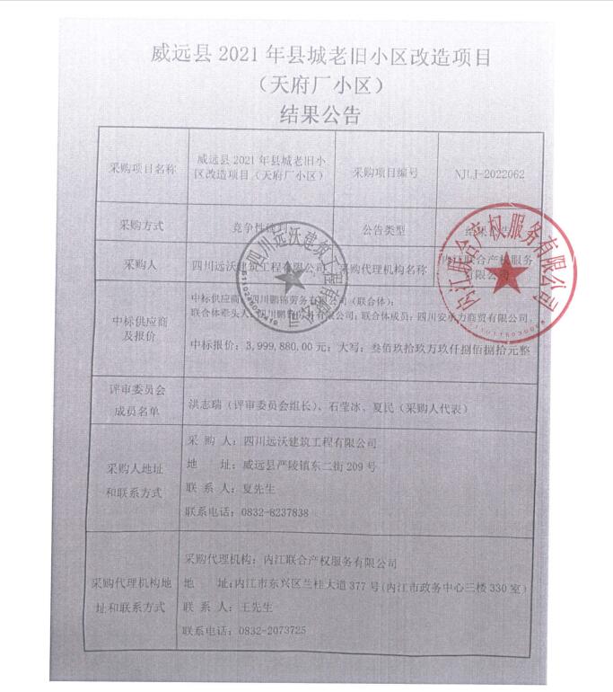 威远县2021年县城老旧小区改造项目(天府厂小区)结果公告