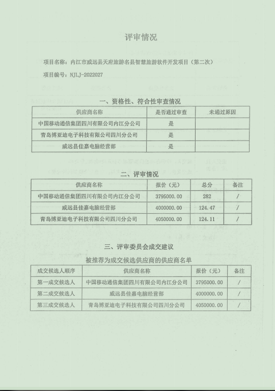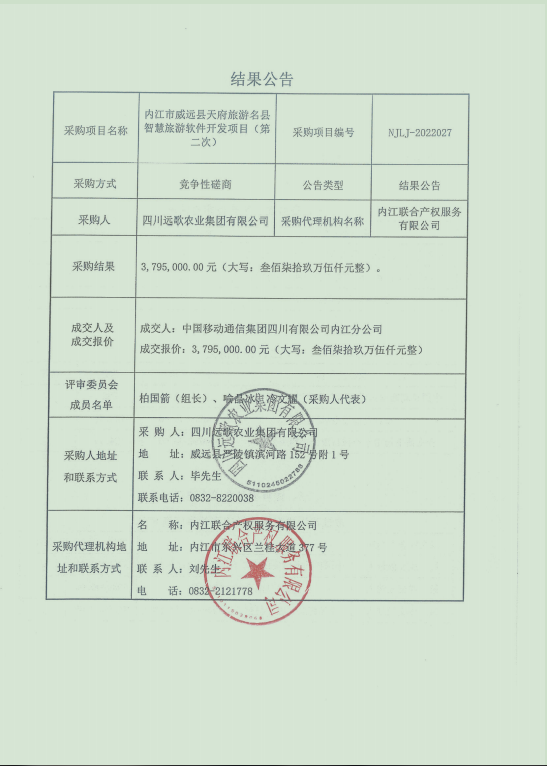 内江市威远县天府旅游名县智慧旅游软件开发项目(第二次)结果公告