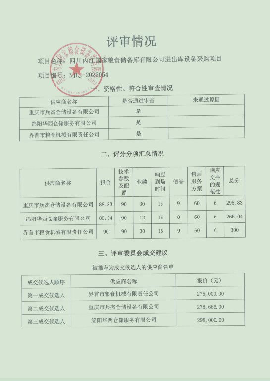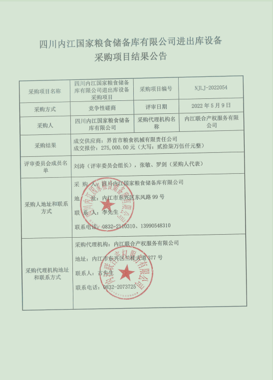 四川内江国家粮食储备库有限公司 进出设备采购项目结果公告