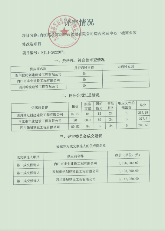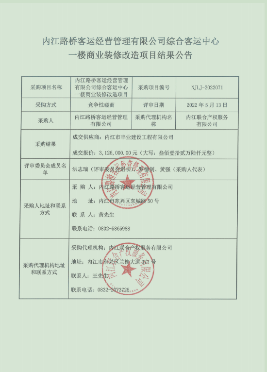 内江路桥客运经营管理有限公司综合客运中心一楼商业装修改造项目结果公告