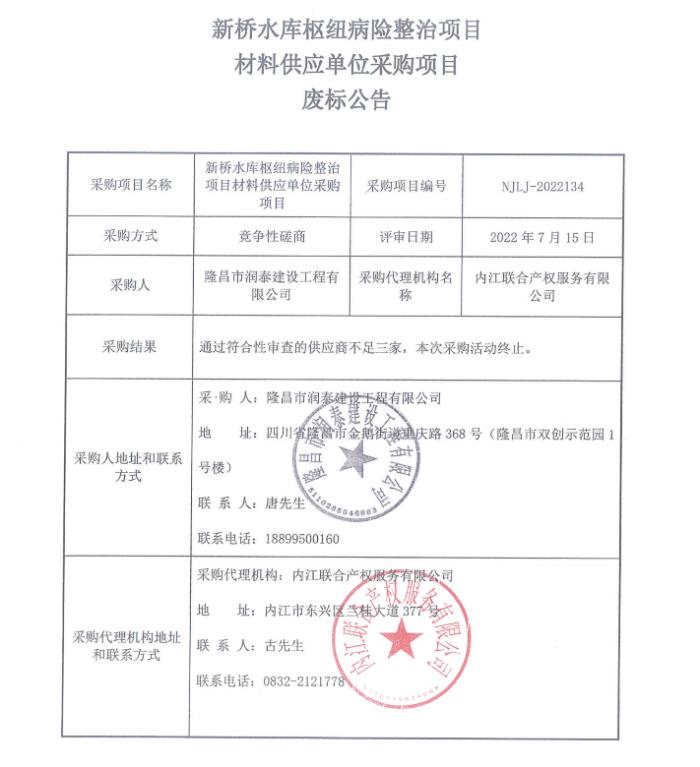 新桥水库枢纽病险整治项目材料供应单位采购项目废标公告