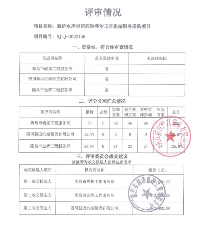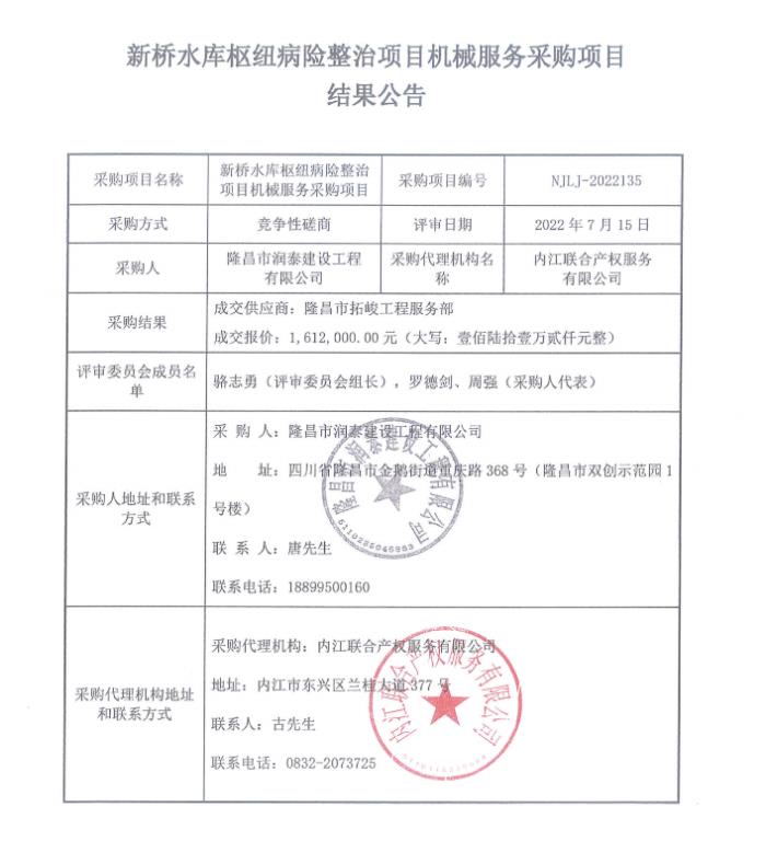 新桥水库枢纽病险整治项目机械服务采购项目结果公告