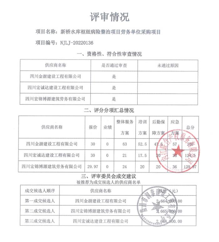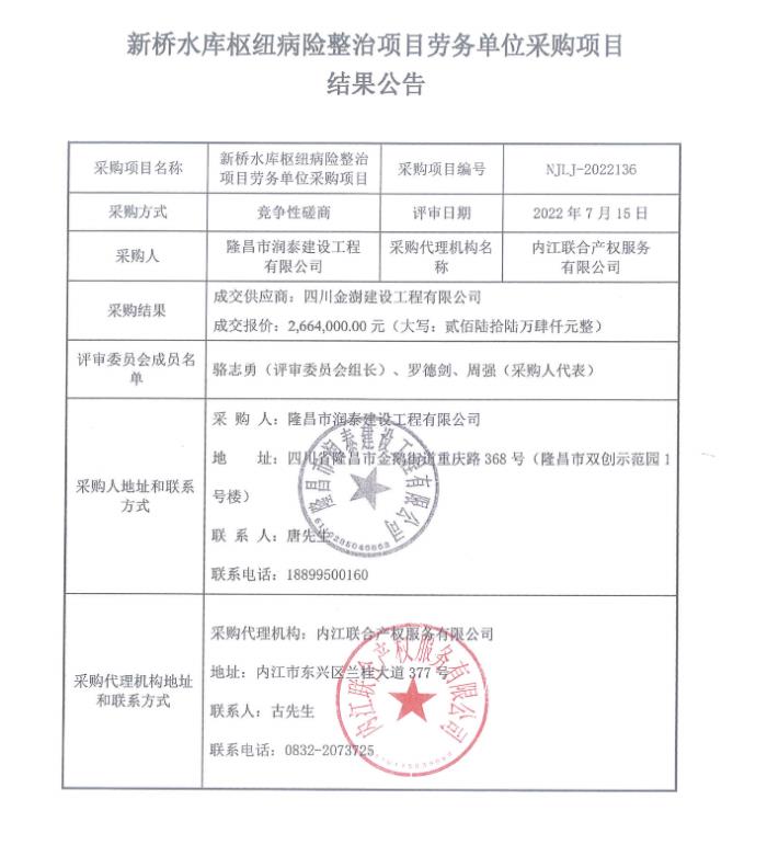 新桥水库枢纽病险整治项目劳务单位采购项目结果公告