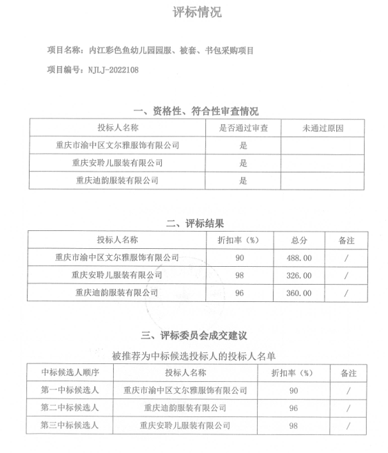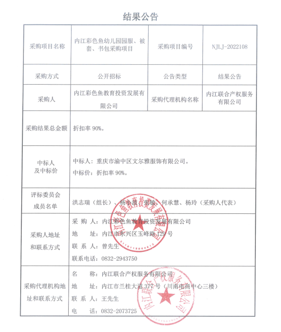 内江彩色鱼幼儿园园服、被套、书包采购项目结果公告