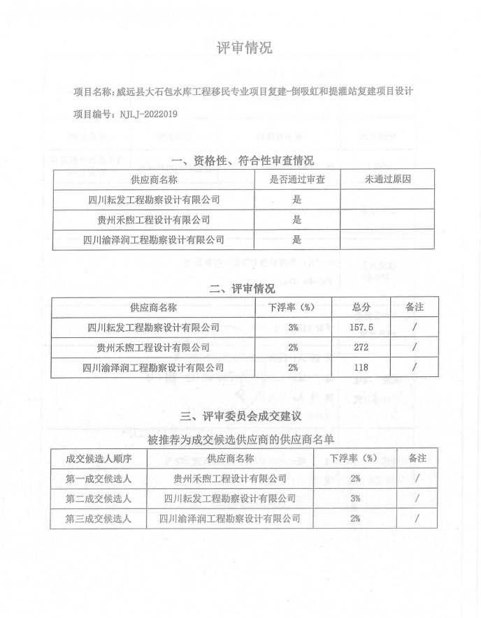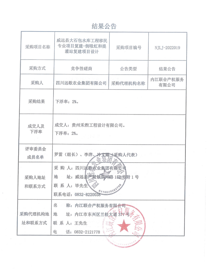 威远县大石包水库工程移民专业项目复建-倒吸虹和提灌站复建项目设计结果公告