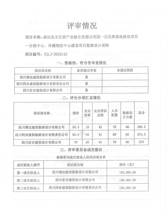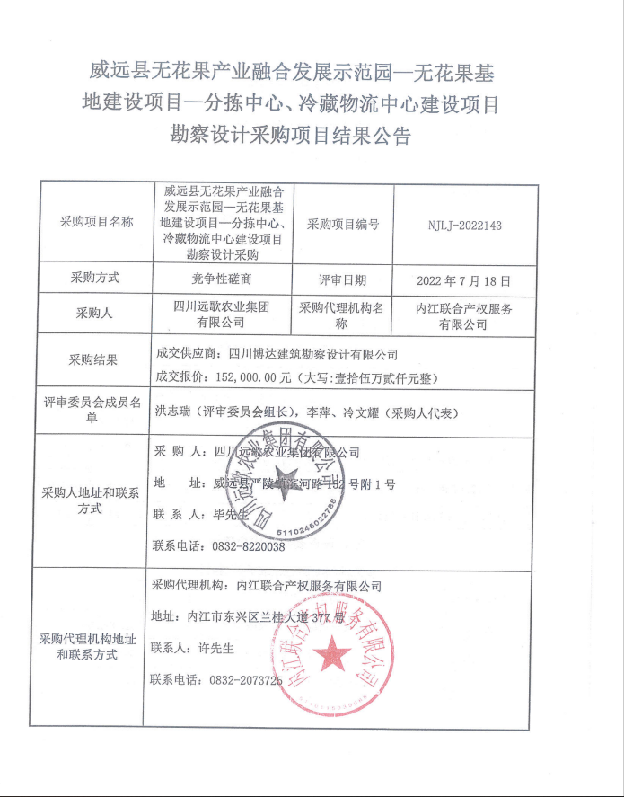 威远县无花果产业融合发展示范园—无花果基地建设项目—分拣中心、冷藏物流中心建设项目勘察设计采购项目结果公告