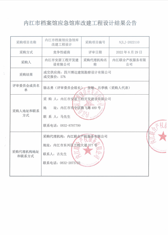 内江市档案馆应急馆库改建工程装饰装修设计结果公告