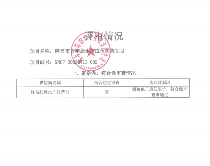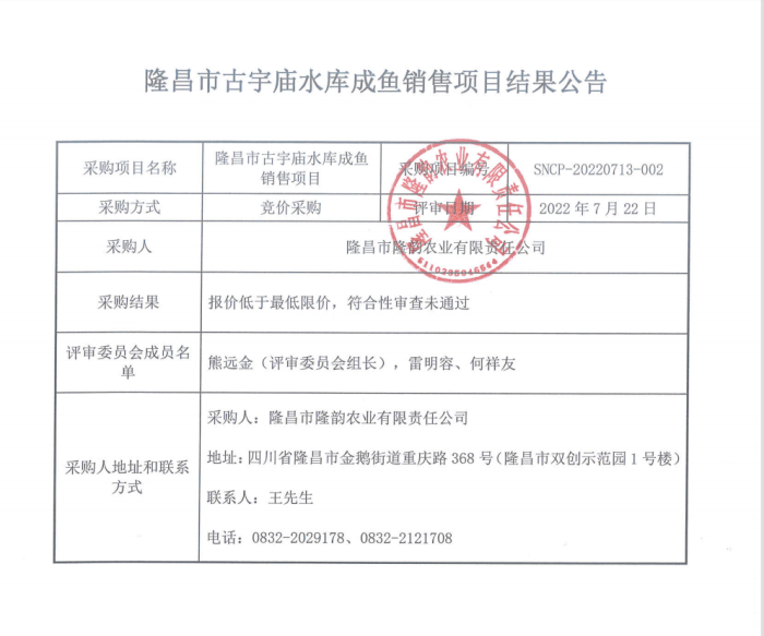 隆昌市古宇庙水库成鱼销售项目结果公告
