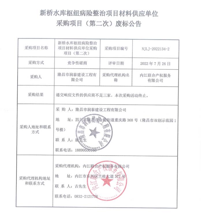 新桥水库枢纽病险整治项目材料供应单位采购项目(第二次)废标公告