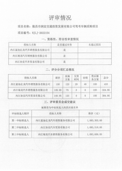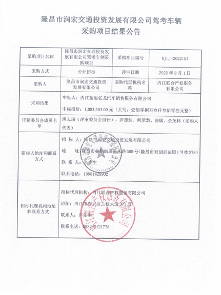 隆昌市润宏交通投资发展有限公司驾考车辆采购项目结果公告