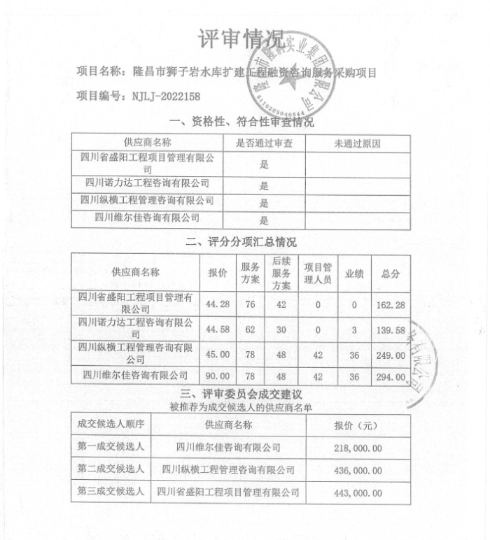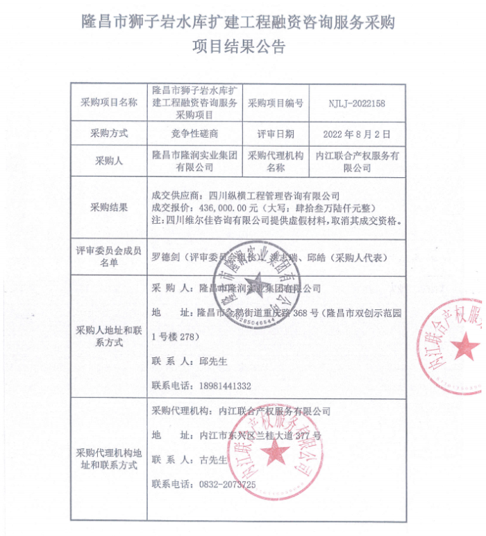 隆昌市狮子岩水库扩建工程融资咨询服务采购项目结果公告
