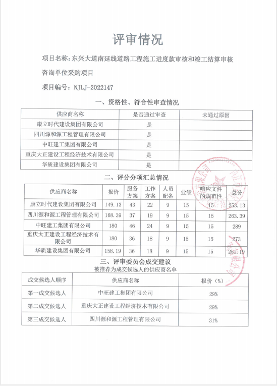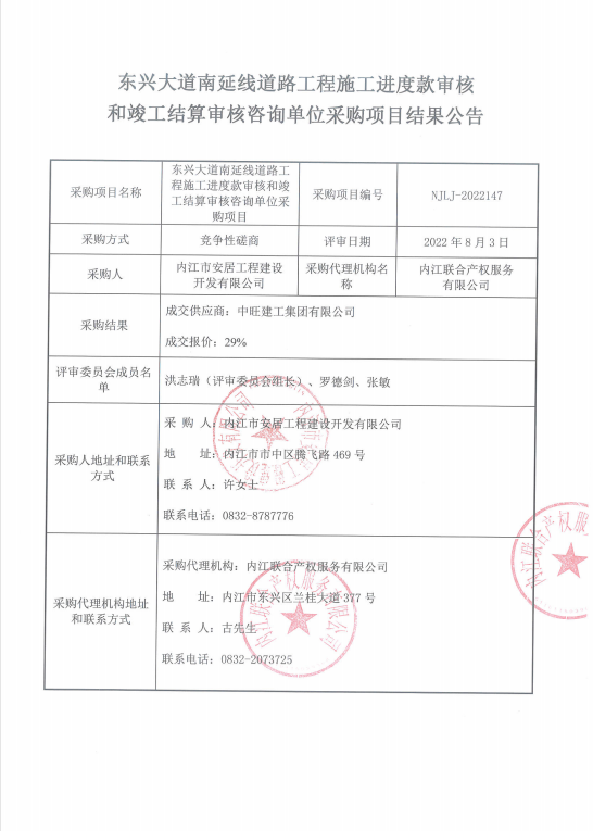 内江市东兴大道南延线道路工程施工进度款审核和竣工结算审核咨询单位采购项目结果公告