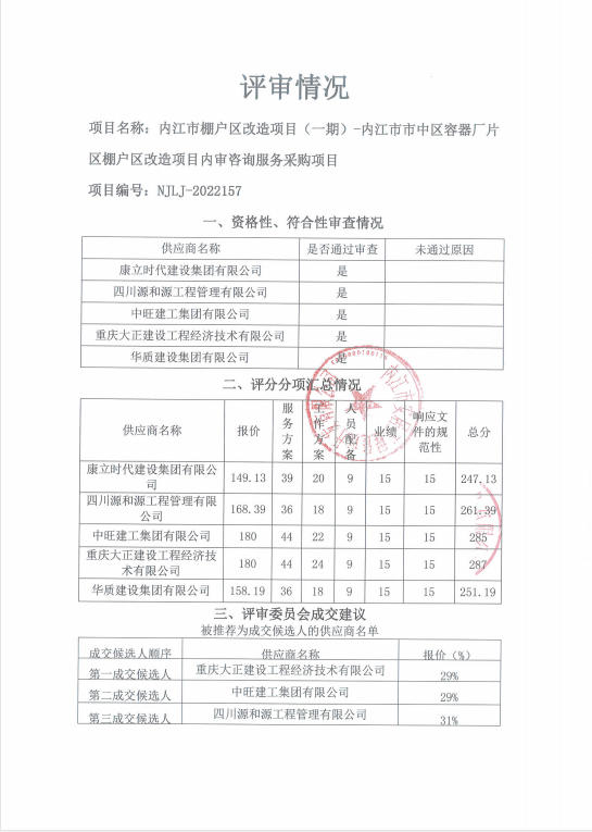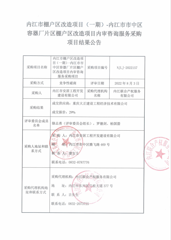 内江市棚户区改造项目(一期)-内江市市中区容器厂片区棚户区改造项目内审咨询服务采购项目结果公告