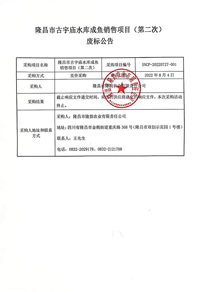 隆昌市古宇庙水库成鱼销售项目(第二次)废标公告