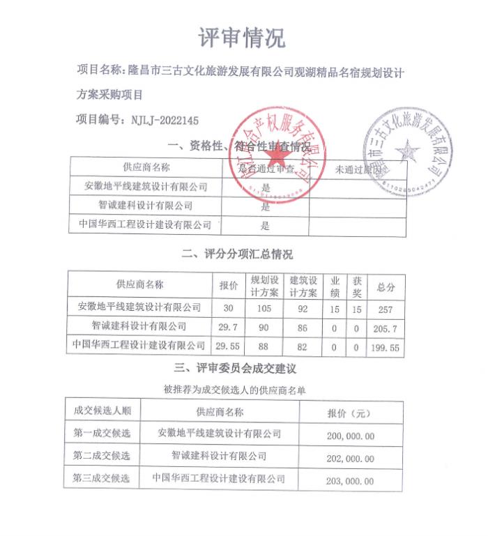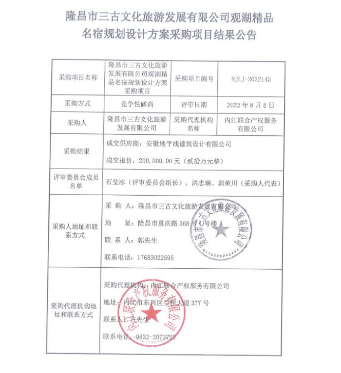隆昌市三古文化旅游发展有限公司观湖精品名宿规划设计方案采购项目结果公告
