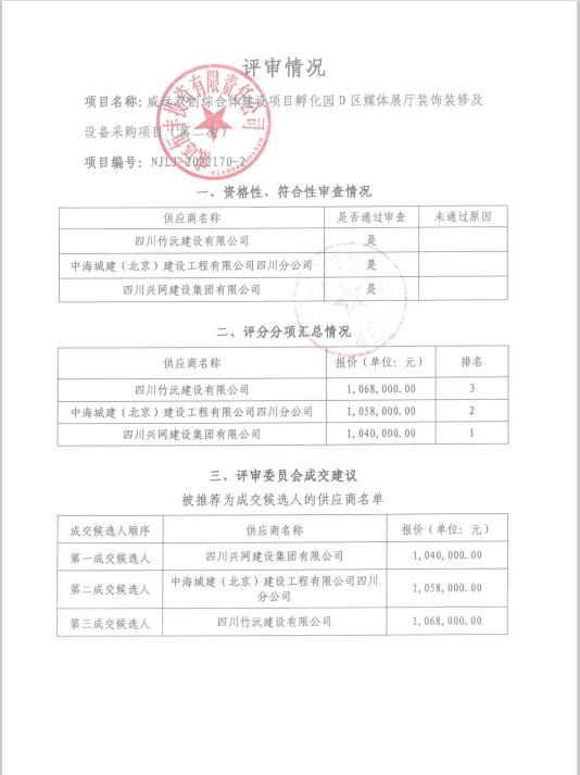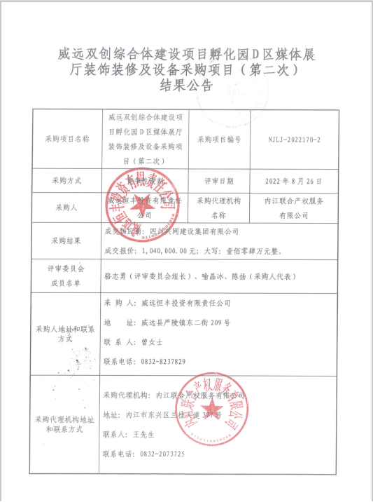 威远双创综合体建设项目孵化园D区媒体展厅装饰装修及设备采购项目(第二次)结果公告