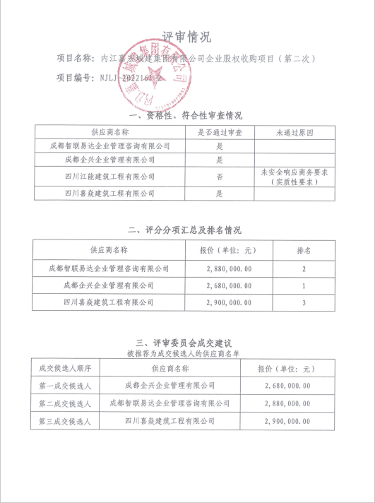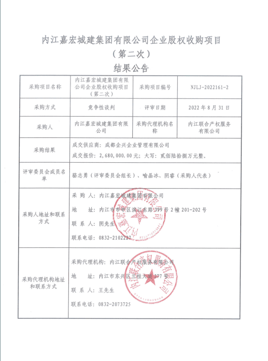 内江嘉宏城建集团有限公司企业股权收购项目(第二次)结果公告