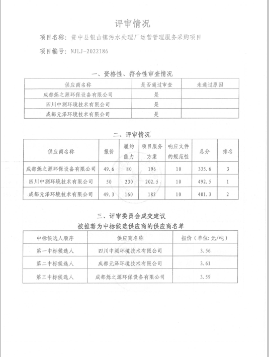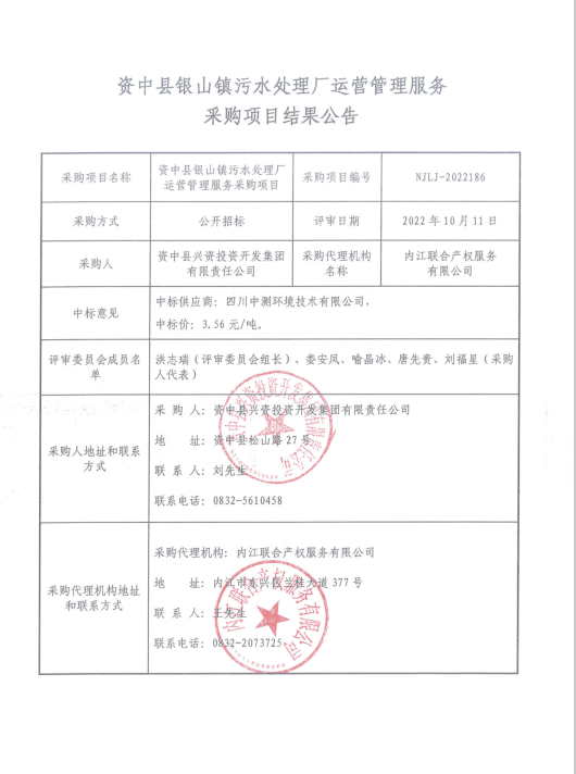 资中县银山镇污水处理厂运营管理服务采购项目结果公告