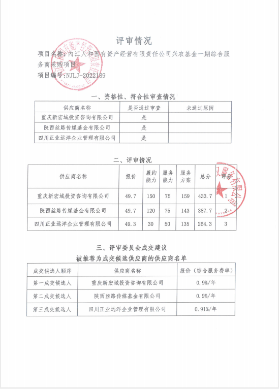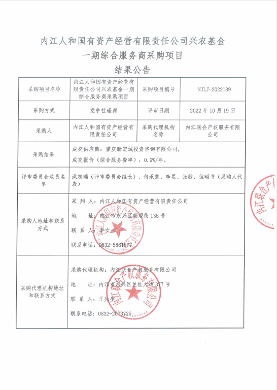 内江人和国有资产经营有限责任公司兴农基金一期综合服务商采购项目结果公告
