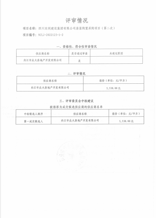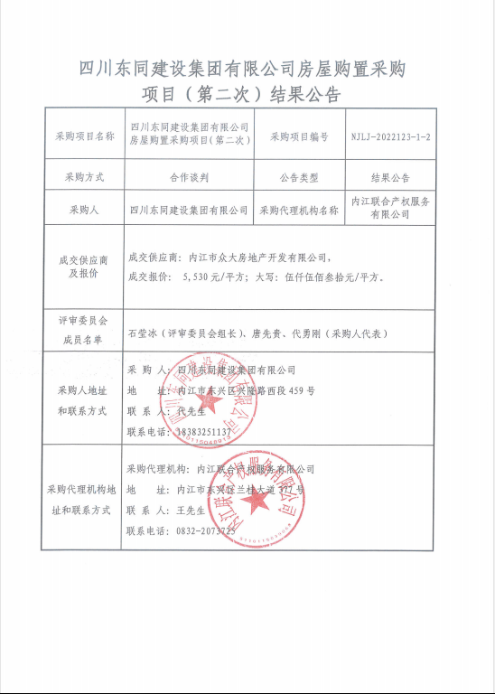 四川东同建设集团有限公司房屋购置采购项目(第二次)结果公告
