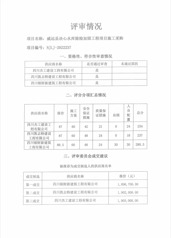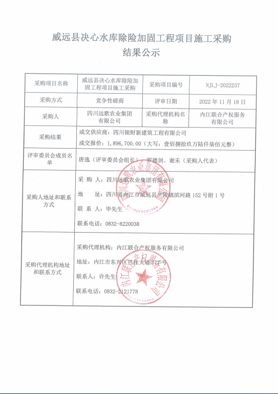 威远县捞草沟水库除险加固工程项目施工采购结果公示