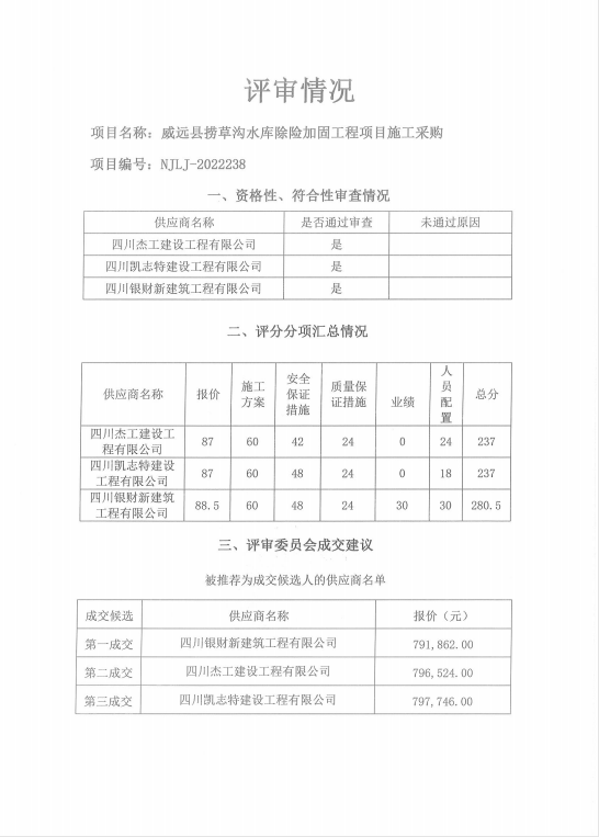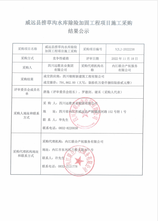 威远县捞草沟水库除险加固工程项目施工采购结果公示