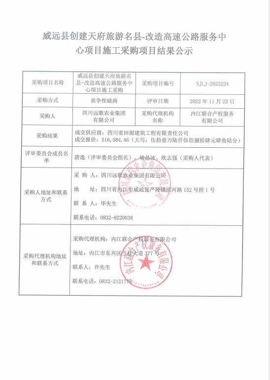 威远县创建天府旅游名县-改造高速公路服务中心项目施工采购结果公示