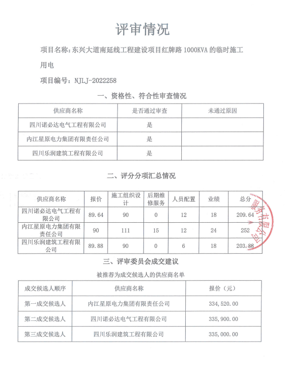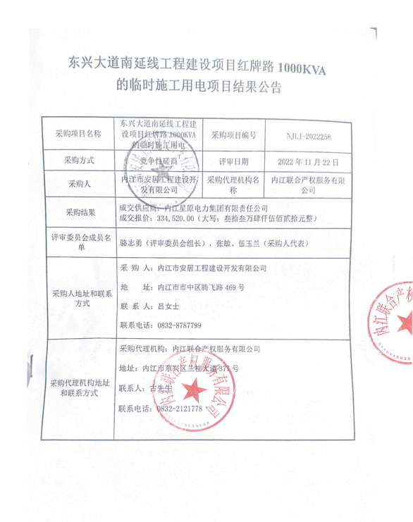 东兴大道南延线工程建设项目红牌路1000KVA的临时施工用电项目结果公告