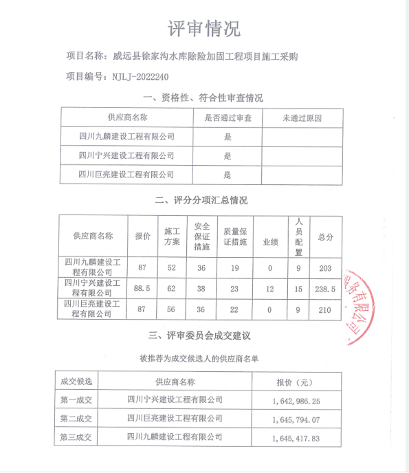威远县徐家沟水库除险加固工程项目施工采购结果公示