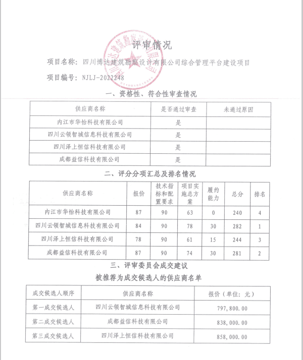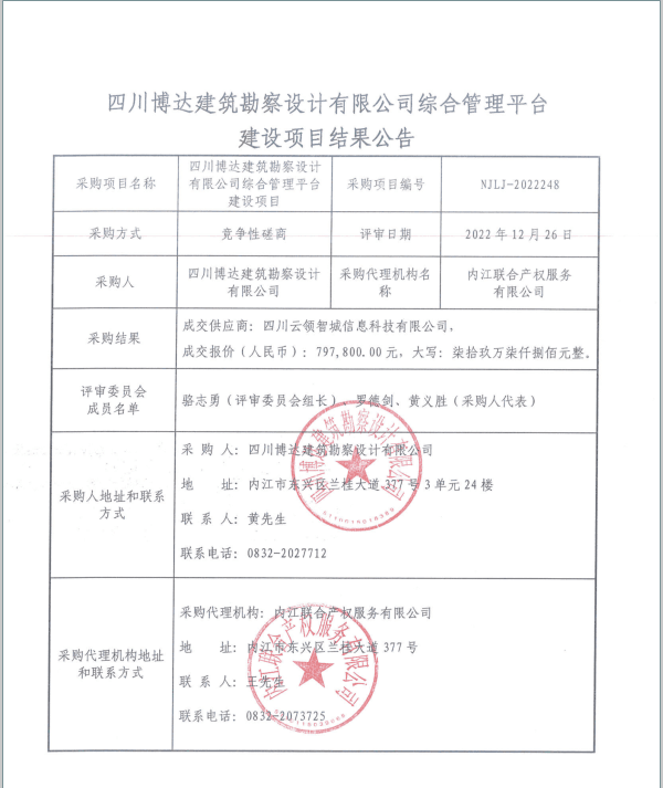 四川博达建筑勘察设计有限公司综合管理平台建设项目结果公告